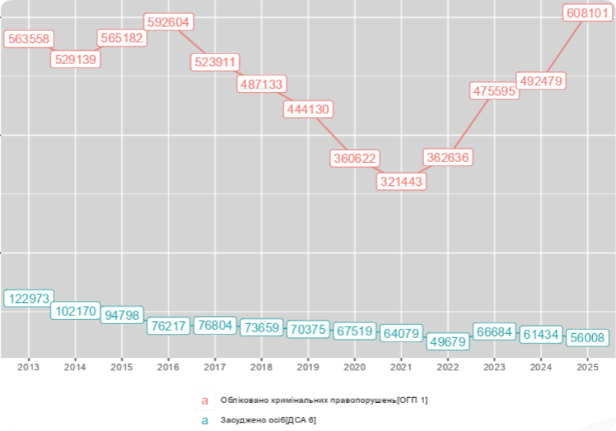 Зростання кількості облікованих проваджень з 492 тис. у 2024 до 608 тис. у 2025 супроводжується зменшенням кількості засуджених осіб (2024 – 61 тис., 2025 – 56 тис.)