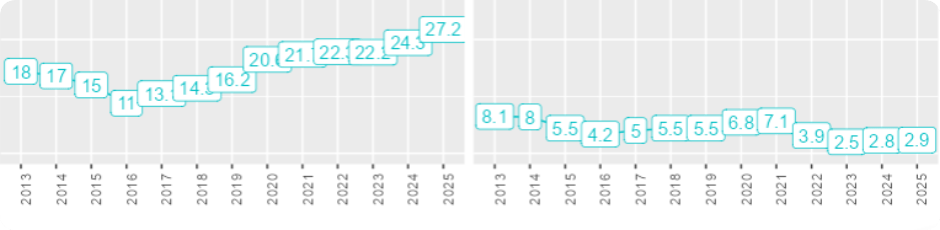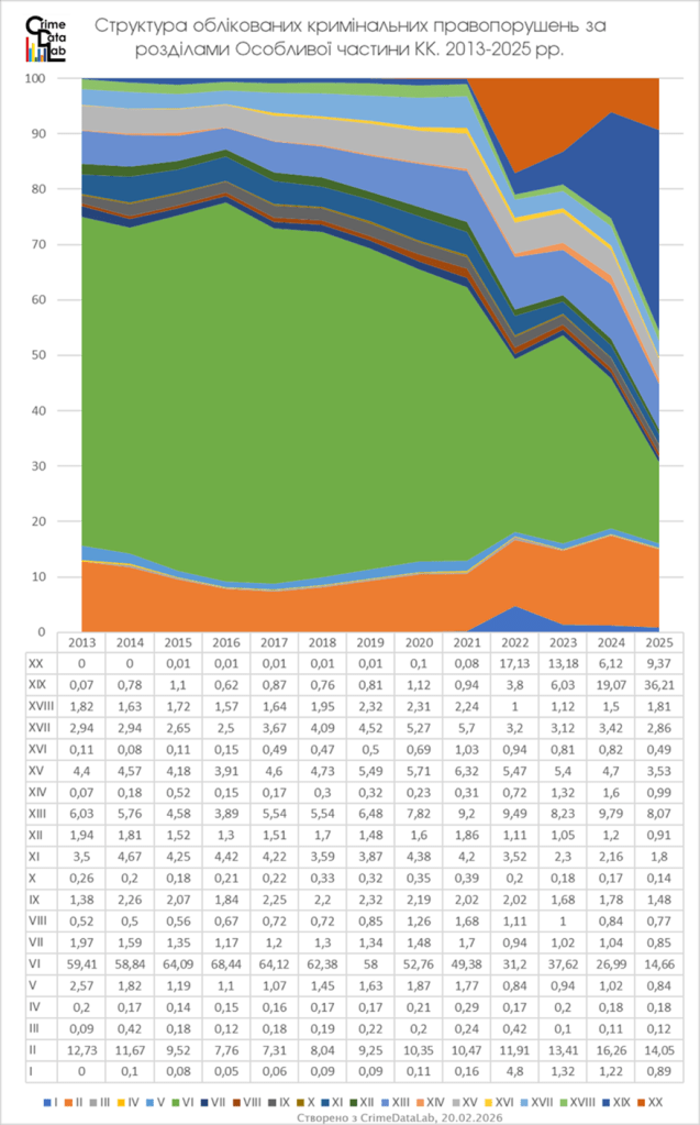 Частка облікованих кримінальних правопорушень проти власності скоротилася до з 27% (2024 рік) до 14.7%, тоді як частка облікованих військових кримінальних правопорушень (Розділ XIX) зросла з 19,1% до 36.2%.