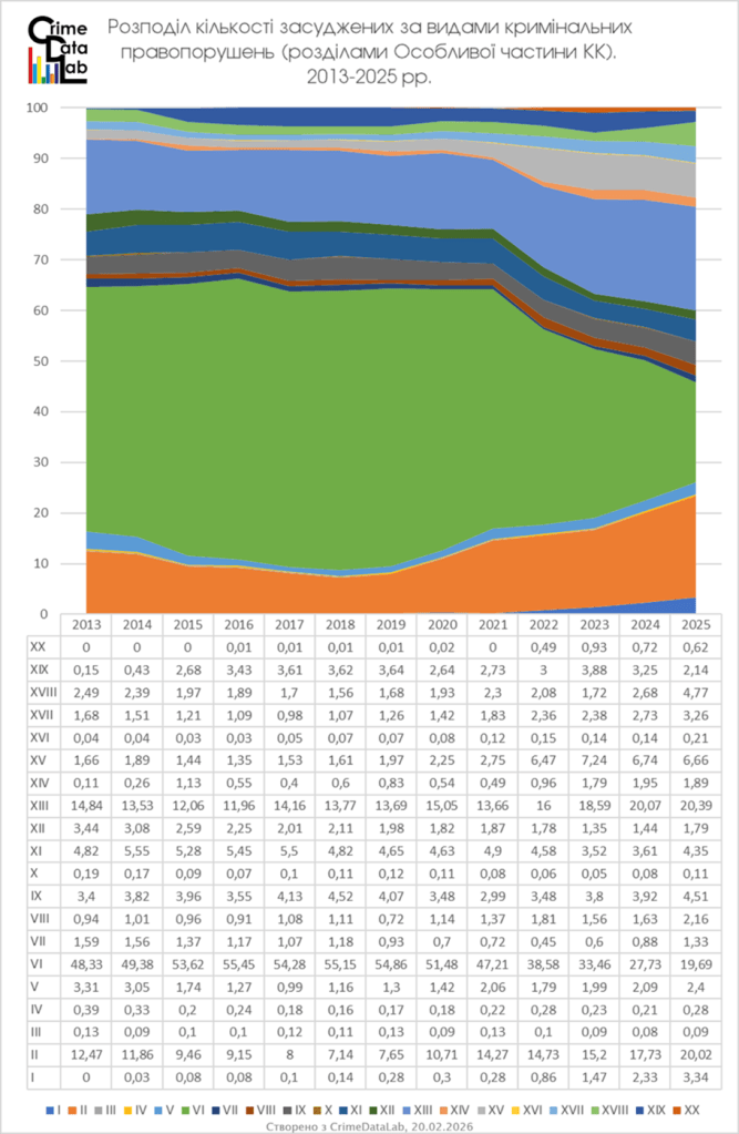 Структура кількості засуджених осіб трансформувалася в інший спосіб. Частки засуджених за кримінальні правопорушення проти життя та здоров’я (Розділ II) та кримінальні правопорушення у сфері незаконного обігу наркотичних засобів (Розділ XIII) зросли, фактично зрівнявшись із часткою засуджених за посягання на власність, що зменшилася. Кожна з цих груп склала у 2025 році близько 20% від всіх засуджених.