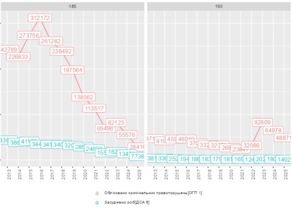 З використанням платформи CrimeDataLab нами проведено аналіз звітів Офісу Генерального Прокурора України про обліковані кримінальні правопорушення та звітів Державної судової адміністрації України про засуджених осіб за 2025 рік.