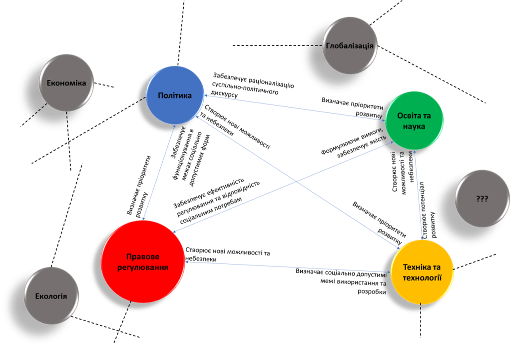 Політика, як результат узгодження різноманітних інтересів членів суспільства, визначає пріоритети розвитку. Право формулює соціально допустимі межі активності. Освіта та наука забезпечують ефективність та потенціал розвитку. Нарешті техніка та технології надають людству нові можливості та створюють нові небезпеки. Названі вузли є частиною значно більшої мережі, тому запропонована модель є певним спрощенням. Однак, вона дозволяє орієнтуватися в результатах досліджень, що представлені на сайті.