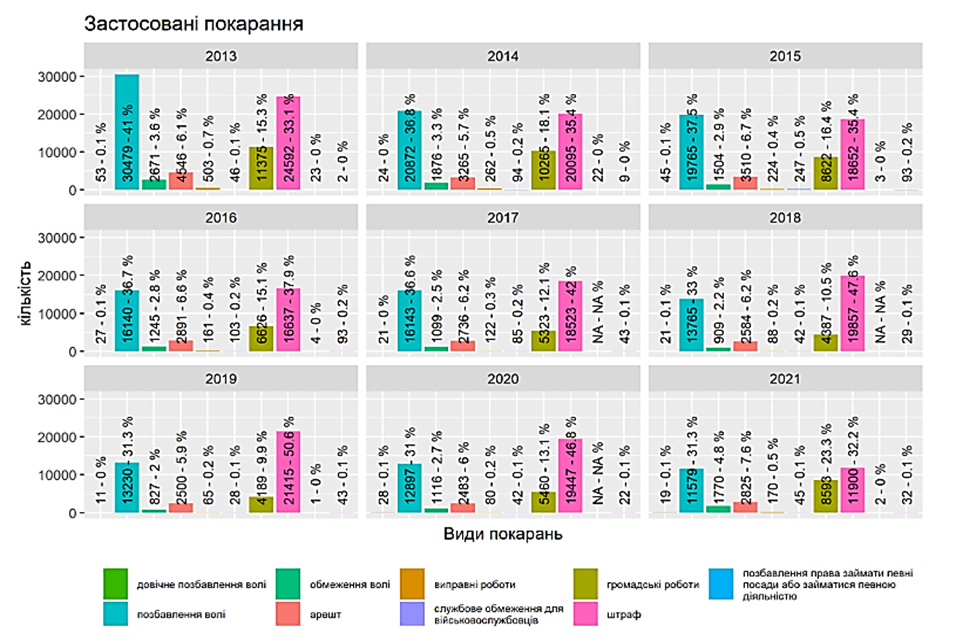 Зменшення суворості покарань полягає в поступовому збільшенні частки штрафів у структурі призначених покарань. До 2016 року найчастіше призначалося позбавлення волі, але, починаючи з 2016 року, штрафи переважають, їх частка є найбільшою та складає від 38 % до 50 % (Рис. 2).