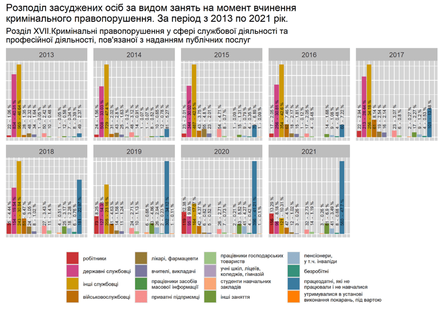 Процес був поступовим, відповідні тенденції зменшення / збільшення кількості засуджених осіб прослідковувалися протягом усього періоду спостережень. Крім того, за даними ДСА, починаючи з 2019 року серед засуджених за правопорушення, передбачені Розділом XVII Особливої частини, найбільшою є частка «працездатні, які не працювали і не навчалися». Розмір цієї частки збільшується від 34 % у 2019 році, до 47 % у 2021 (Рис. 11).