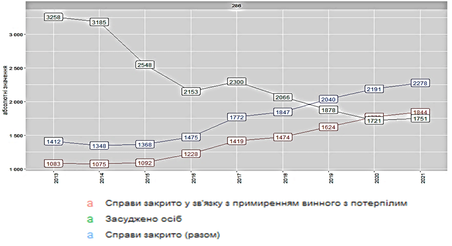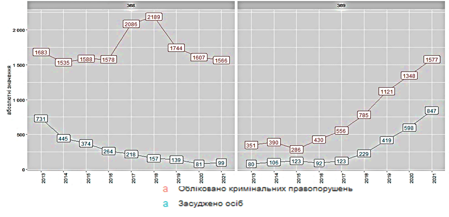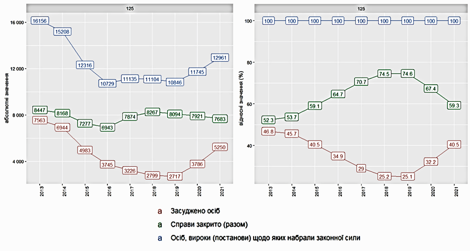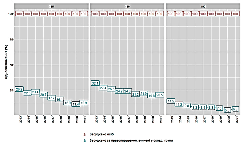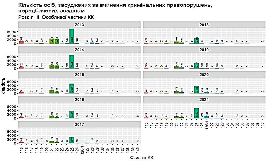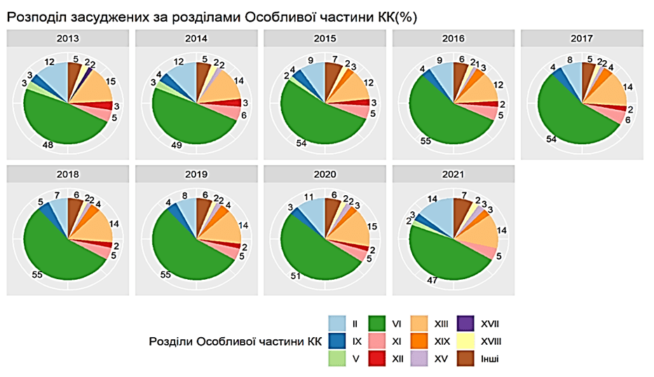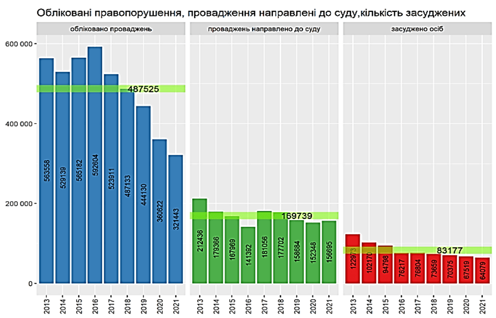 Ключові тенденції, що характеризують кримінально-правове регулювання в Україні в період із 2013 по 2021 роки, такі: зменшення кількості облікованих проваджень (Рис. 1) і засуджених осіб, зменшення суворості покарань, що призначаються[2].