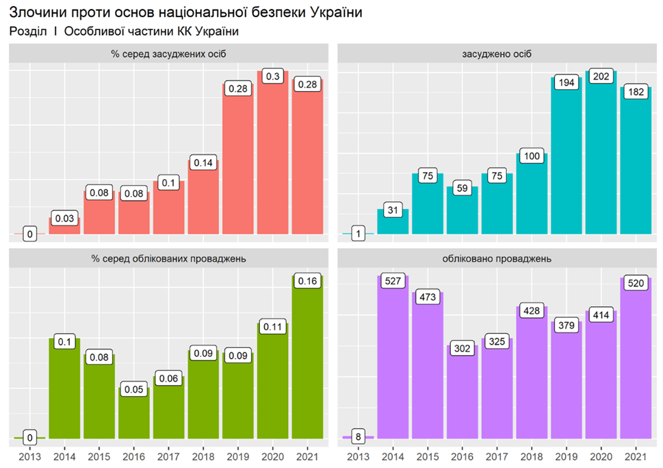 Період спостережень охоплює 8 років війни з рф (з 2014 по 2021 рік), і в цьому контексті значний інтерес має аналіз ефективності кримінально-правового регулювання у сфері основ національної безпеки. У вітчизняній науці представлено змістовний аналіз відповідних норм кримінального законодавства [26; 27; 31; 33]. Водночас, здійснений нами аналіз дозволяє проаналізувати проблему під кутом відображеного в кримінальній статистиці практичного досвіду застосування норм, що містяться в першому розділі Особливої частини КК. Починаючи з 2014 року, щороку обліковується близько 500 проваджень щодо правопорушень, передбачених Розділом І Особливої частини КК. Така кількість дорівнює близько 0,1 % від облікованих проваджень. Щороку за дані правопорушення засуджується до 200, частка серед всіх засуджених – від 0,1 до 0,3% (Рис. 13).