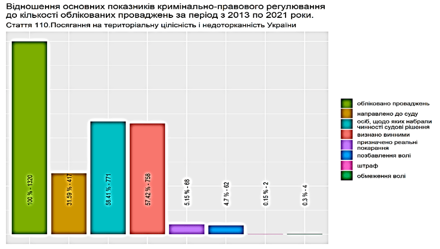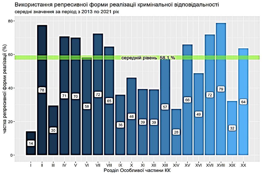 При тому, судові рішення, пов’язані з використанням статей Розділу І Особливої частини КК, характеризуються найменшим рівнем використання репресивної форми відповідальності серед усіх розділів Особливої частини КК. За період спостережень (2013-2014) середній рівень використання репресивної форми склав близько 60 %, у випадках засудження за злочини проти основ