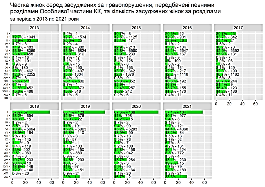 Починаючи з 2017 року частка жінок серед засуджених за злочини, передбачені Розділом І Особливої частини КК, є найбільшою серед часток засуджених жінок за правопорушення, передбачені іншими розділами (Рис. 17).