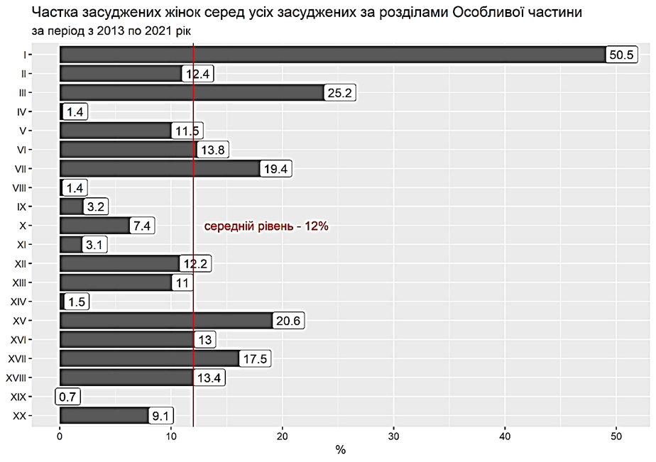 - найбільшою часткою жінок серед засуджених – більше 50 % (середній рівень 12 %);