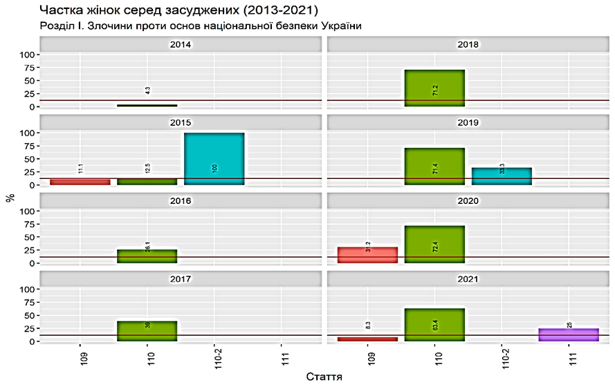 За період спостережень частка жінок серед засуджених складає 12 %, для злочинів проти основ національної безпеки – більше 50 % (Рис.18).