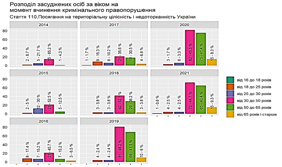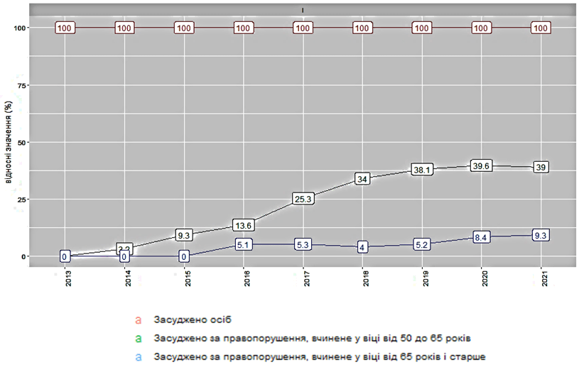 Частка засуджених за злочини, передбачені Розділом І, віком від 50 років поступово збільшувалася з 2014 року (Рис. 21).