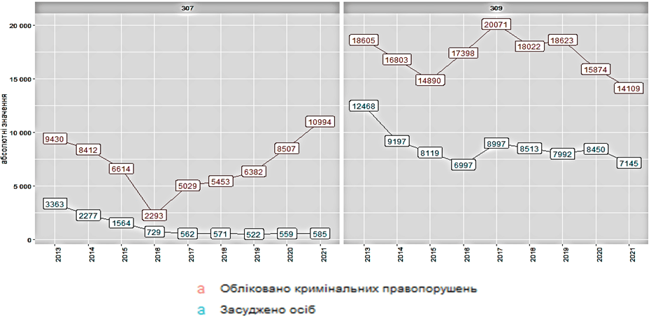 Видається, що означені коливання пов’язані радше з процесами реформування підрозділів Національної поліції щодо протидії незаконному обігу наркотиків, а загальне падіння показників обліку й засудження не свідчить про те, що відповідна соціальна проблема набула меншої гостроти. Такий висновок підтверджує і динаміка засудження за кримінальні правопорушення, передбачені статтями 307 та 309 (Pис. 9).