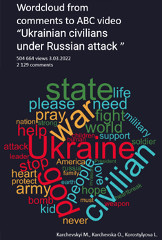 Зокрема, реалізовано проєкти, які демонструють варіативність джерел інформації, що може бути використана для аналізу. Цілком зрозуміло, що для більшості завдань нами використано статистичні звіти, представлені офіційних інтернет-сайтах Офісу Генерального Прокурора України та Державної судової Адміністрації України. Водночас, ці та подібні джерела не єдині, які можна використовувати для обчислювального кримінологічного аргументування. Так відкрите програмне забезпечення Web Scraper [16] дозволяє автоматизовано збирати дані з різноманітних інтернет-джерел. Використовуючи його, нами здійснено збір коментарів до відео про розв’язання рф війни проти нашої Держави. Воно було розміщено на каналі YouTube одного із засобів масової інформації США [17]. На момент проведення аналізу відео мало більше пів мільйона переглядів та 2 129 коментарів. Завдяки середовищу для статистичних обчислень R [18] та бібліотеці для нього “tm” (text mining) [19], зібрані коментарі було трансформовано у перелік слів, які найчастіше вживалися у коментарях, обчислено кількість використання кожного з таких слів. Нарешті, із застосуванням одного з онлайн-сервісів побудови візуалізацій типу «хмара тегів» [20], було здійснено графічне представлення даних щодо частоти використаних слів[1]. Отриманий результат (Рис. 1) дає можливість швидко оцінити настрої аудиторії цього ЗМІ щодо злочинного розв’язання рф міжнародного збройного конфлікту. Переважними темами коментарів були підтримка України, небезпека шкоди цивільним особам, необхідність протидії агресії.