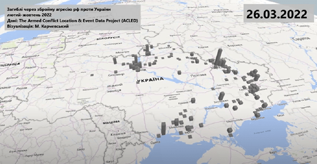Важливим джерелом даних для обчислювального кримінологічного аргументування можуть бути спеціалізовані відкриті бази даних. Наприклад, для дослідження жертв російської агресії в Україні нами було використано базу даних The Armed Conflict Location & Event Data Project (ACLED) [21]. Здійснивши запит із бази даних проєкту за ознаками простору та часу (Україна, 24.02.2022-28.10.2022), отримано інформацію про загиблих у результаті агресії рф, час смерті та географічні координати місць трагічних подій. Використавши модуль MS Excel 3D Maps [22], створено анімацію, яка дозволяє охарактеризувати географічний розподіл воєнних злочинів рф, вчинених протягом досліджуваного періоду (Рис. 2). Примітно, що тривалість вказаного відео становить 30 секунд, для його побудови взято масив даних приблизно з 10 тис. показників. Очевидно, що перегляд даних у вигляді таблиці, навіть протягом години, навряд чи забезпечить отримання уявлення про зміст даних краще ніж перегляд тридцятисекундного відео [23].