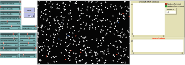 Обчислювальне кримінологічне аргументування не обмежується тільки візуальним аналізом даних. З використанням методу агентного моделювання (agent based modelling) та програмного забезпечення NetLogo [24], нами було проведене пілотажне дослідження протидії злочинності на основі створення моделі суспільства (Рис. 3). Ключові положення, що характеризують даний метод, наступні: «агент – автономний обчислюваний об’єкт із певними властивостями та діями; агенте моделювання – вид обчислювального моделювання, де явище моделюється шляхом визначення агентів та їх взаємодії» [25, с. 1]. Реалізується таке моделювання шляхом використання спеціалізованого програмного забезпечення, яке дозволяє описати властивості агентів та обчислювати їх взаємодію. Результат застосування такого методу прийнято називати штучним суспільством (artificial society), що визначається як «створена з використанням комп’ютерної техніки симуляційна модель суспільства або групи людей, котра базується на агентах та зазвичай обмежена їх взаємодією в конкретній ситуації» [26]. Шляхом комп’ютерного моделювання було підтверджено важливу гіпотезу: посилення покарання є менш ефективним, ніж заходи, не пов’язані з репресією [27].