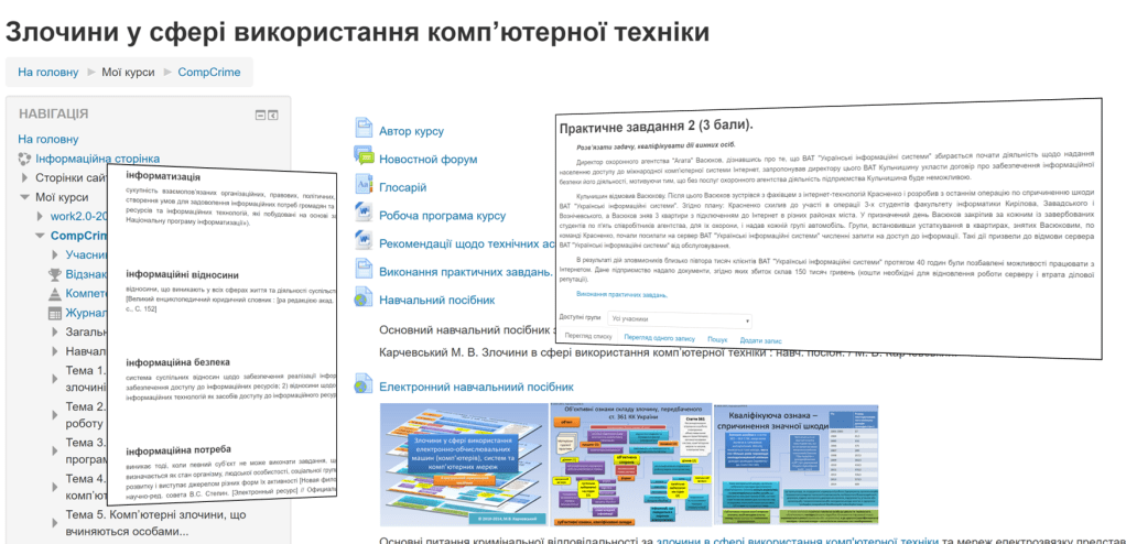 Дистанційний курс “Злочини у сфері використання комп’ютерної техніки” на сервері дистанціного навчання Луганського державного університету внутрішніх справ імені Е.О. Дідоренка. Для перегляду можна використовувати гостьовий доступ